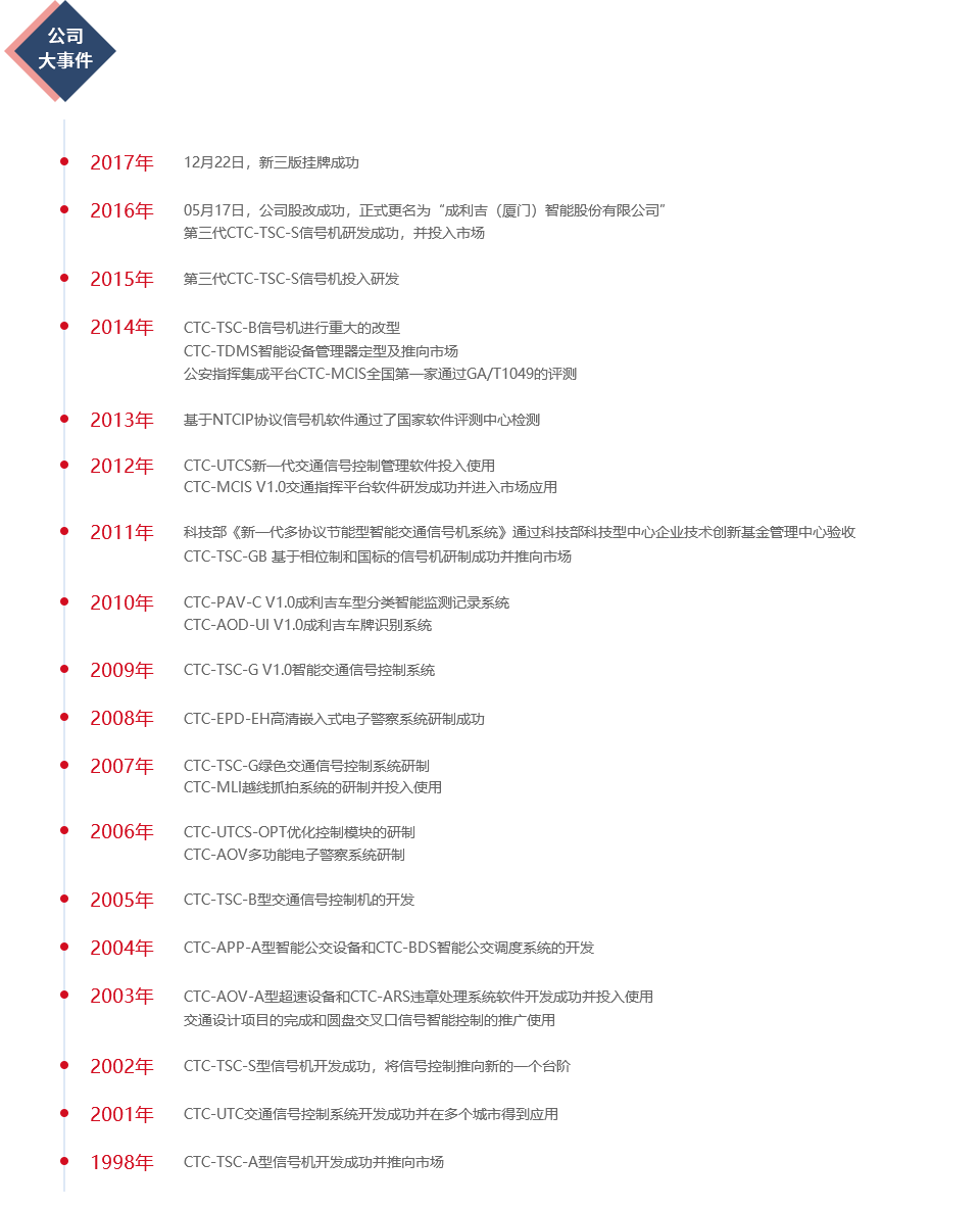 成利吉(廈門)智能股份有限公司,成立于1998年,是國(guó)內(nèi)最早從事智能交通領(lǐng)域產(chǎn)品研發(fā)和應(yīng)用、專業(yè)智能交通核心軟件開發(fā)、智能交通系統(tǒng)集成與運(yùn)營(yíng)服務(wù)的企業(yè)之一。公司于2016年5月正式更名為成利吉(廈門)智能股份有限公司,并于2017年12月22日新三版成功掛牌。
